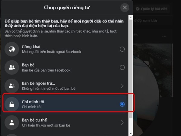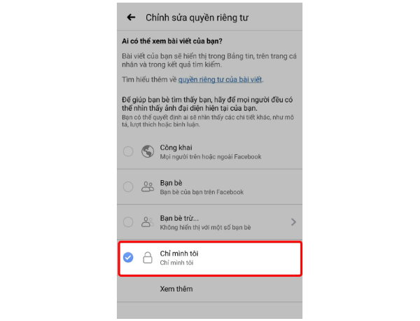 Bước 5: Chọn vào thuộc tính Chỉ mình tôi sau đó chọn mũi tên ở vị trí trên góc trái màn hình, là hoàn tất.