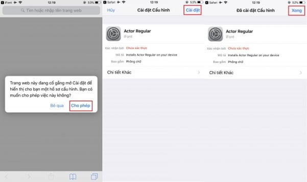 Nhấn Cho phép (Allow) khi được nhắc mở cấu hình trong ứng dụng cài đặt của thiết bị. Sau đó nhấn Cài đặt(Install) khi được nhắc nhở cài đặt font chữ bạn đã chọn. Sau đó hãy nhấn Xong (Done) sau khi cấu hình được cài đặt.
