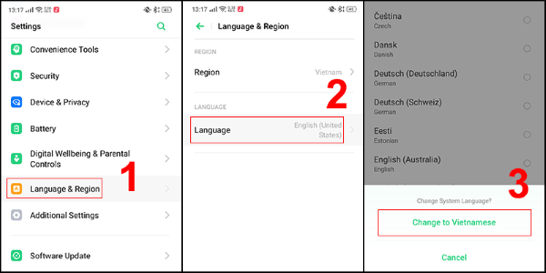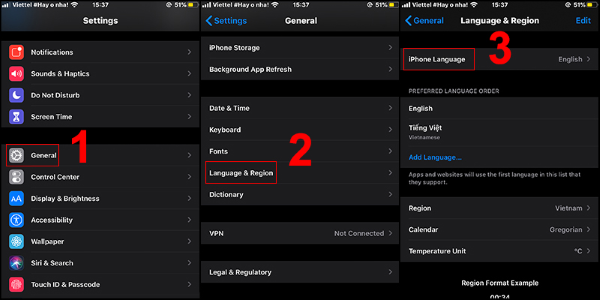 Đi tới Ngôn ngữ & Khu vực (Language & Region) > Chọn Ngôn ngữ (Language) > Chọn Tiếng Việt > Xác nhận thay đổi sang Tiếng Việt (Change to Vietnamese) > Nhập mật khẩu thiết bị (nếu có yêu cầu).
