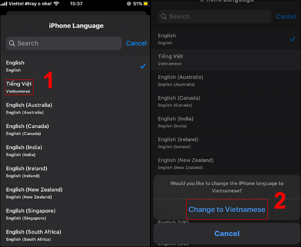 Mở phần Ngôn ngữ iPhone (iPhone Language) > Chọn Tiếng Việt > Xác nhận thay đổi sang tiếng Việt (Change to Vietnamese).