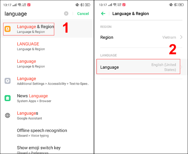 Ngoài ra, bạn có thể dùng chức năng Tìm kiếm trong Cài đặt, nhập từ khóa Language, sau đó chọn Language & Region.