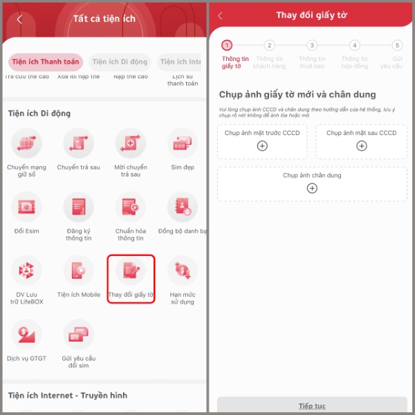 Bước 2: Chọn mục Thay đổi giấy tờ > Sau đó nhập đầy đủ và chính xác các thông tin liên quan như Thông tin khách hàng, Thông tin thuê bao, Thông tin hợp đồng vào.