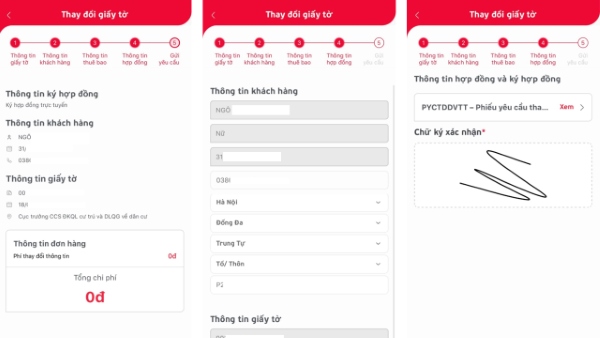 Bước 3: Sau khi hoàn thành nhập thông tin, bạn ký Chữ ký xác nhận > sau đó nhấn Tiếp tục 2 lần để gửi yêu cầu. Cuối cùng, nhập mã Xác nhận OTP là đã hoàn thành cách đổi sim chính chủ tại nhà.