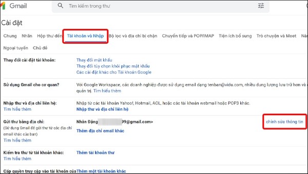 Chuyển sang mục “Tài khoản và Nhập” (Accounts and Import). Tại đây, bạn sẽ thấy phần “Gửi thư bằng địa chỉ”, là nơi cho phép chỉnh sửa tên hiển thị của email.
