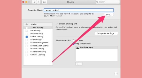 Bước 4: Nếu cần thay đổi tên máy chủ, chọn Edit. Tên máy chủ giúp các thiết bị khác trong cùng một mạng có thể nhận diện và kết nối với MacBook của bạn.