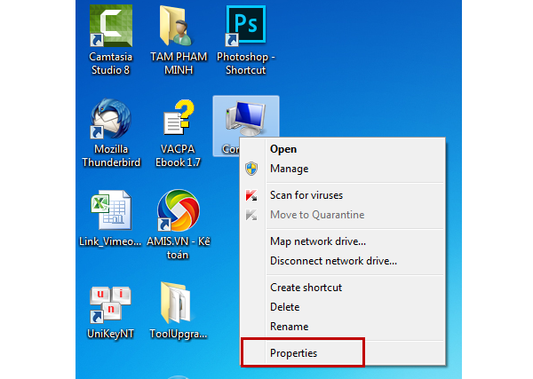 – Tại màn hình chính (Desktop), nhấp chuột phải vào biểu tượng Computer (hoặc My Computer, tùy máy).