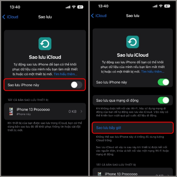 Bước 4: Bật mục Sao lưu iPhone này > nhấn vào Sao lưu bây giờ và đợi quá trình này hoàn tất là bạn đã thành công đồng bộ danh bạ iPhone lên iCloud.