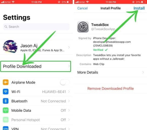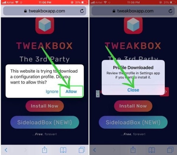 Đầu tiên, bạn mở ứng dụng Safari trên iPhone và truy cập vào trang web TweakBox. Sau đó, nhấn nút Install now > Chọn mục Cho phép (Allow) để tải Tweakbox về điện thoại.