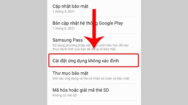 Đầu tiên, bạn hãy truy cập vào ứng dụng Cài đặt trên điện thoại Android > Nhấn chọn mục Bảo mật và kích hoạt tính năng Cài đặt ứng dụng không xác định.