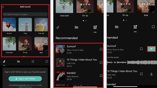 Khi chọn âm thanh để chèn vào video, bạn có thể chọn âm thanh từ thư mục trên Capcut, âm thanh có sẵn, nhạc từ TikTok,…