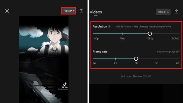- Nhấn chọn vào biểu tượng chất lượng video > độ phân giải, tốc độ khung hình. Lưu ý: Mức cao nhất được CapCut hỗ trợ là 2K/4K và 60 FPS. Nếu bạn chọn độ phân giải và tốc độ khung hình cao thì dung lượng video sẽ lớn.