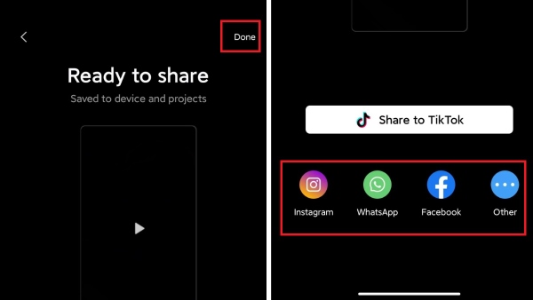 - Cuối cùng nhấn Done để hoàn tất xuất video hoặc có thể chọn chia sẻ video trực tiếp lên các nền tảng mạng xã hội mong muốn.