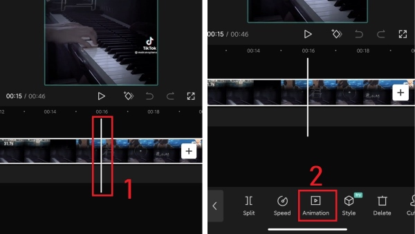 Sau khi chèn video muốn edit vào CapCut, bạn chọn vào video ngay tại điểm muốn chèn hiệu ứng chuyển cảnh và chọn “Animation”.