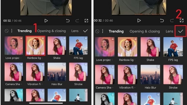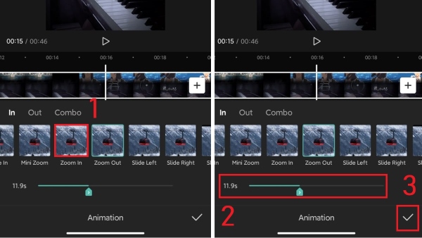 Chọn hiệu ứng chuyển cảnh mong muốn > kéo thanh cuộn để tăng hoặc giảm độ nhanh chậm của hiệu ứng > nhấn vào biểu tượng dấu tích để lưu lại.