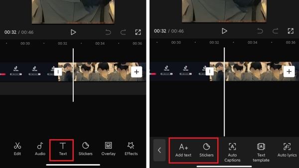Trên thanh công cụ, bạn chọn mục “Text” > chọn “Add text” để thêm text hoặc chọn “Stickers” để thêm nhãn dán.