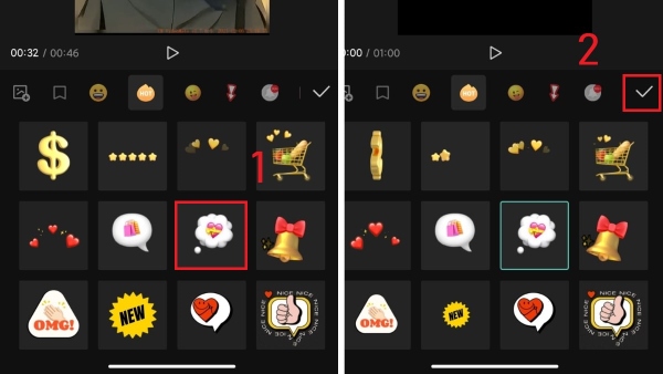 Bạn gõ văn bản cần chèn vào video rồi tùy chỉnh font chữ, kích cỡ, vị trí. Sau đó nhấp vào dấu tch để lưu lại. Cách thêm nhãn dán thực hiện tương tự.