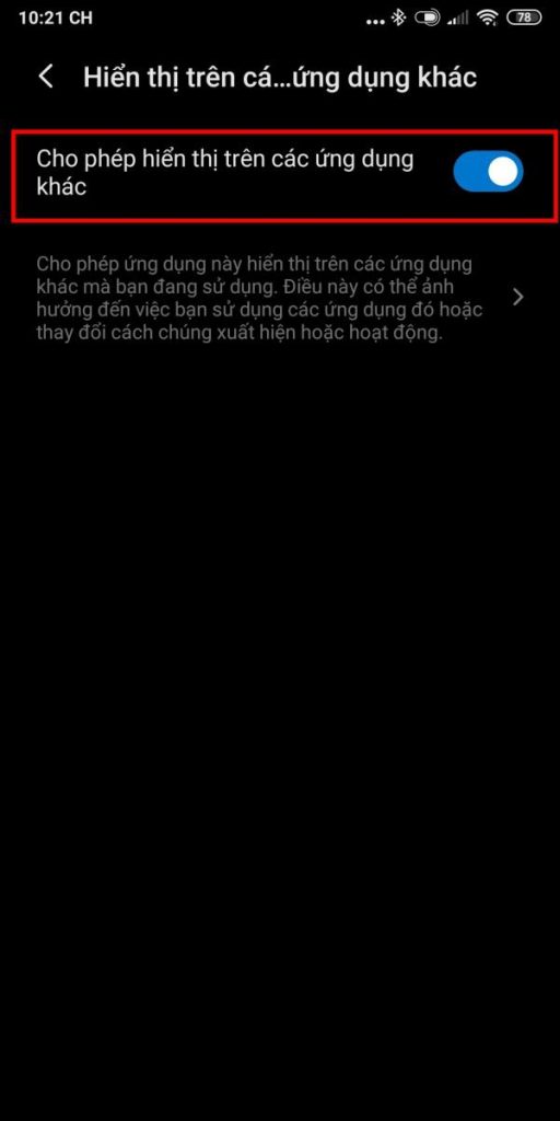 Chuyển chế độ Cho phép hiển thị trên các ứng dụng khác từ trạng thái Off sang trạng thái On bằng cách gạt công tắc sang phải. Lúc này, cuộc trò chuyện mà bạn đã ghim sẽ hiển thị dạng bong bóng chat và luôn nổi trên các ứng dụng khác.