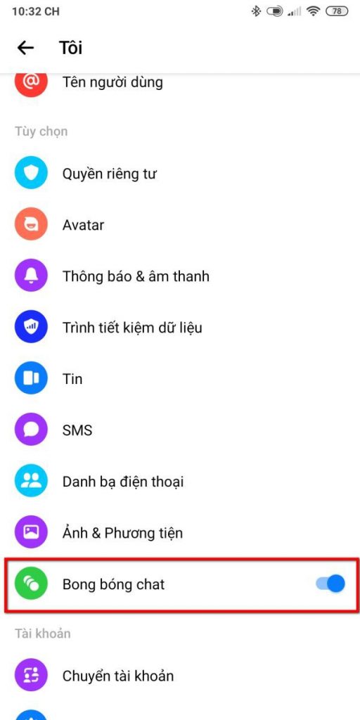 Trong cửa sổ chat của ứng dụng Messenger, bạn kích vào hình đại diện tài khoản của mình ở góc trên cùng bên trái > Trong menu mới hiển thị, bạn kéo xuống dưới và tìm tùy chọn Bong bóng chat > Nếu tùy chọn đang ở trạng thái màu xám nghĩa là tính năng này chưa được kích hoạt > Bạn chỉ cần gạt sang On (màu xanh) để bật tùy chọn Bong bóng chat.