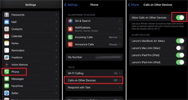 Trên iPhone của bạn, hãy mở ứng dụng Cài đặt và tìm đến mục Điện thoại. Sau đó, chọn Cuộc gọi trên thiết bị khác và bật tùy chọn Cho phép cuộc gọi trên thiết bị khác.