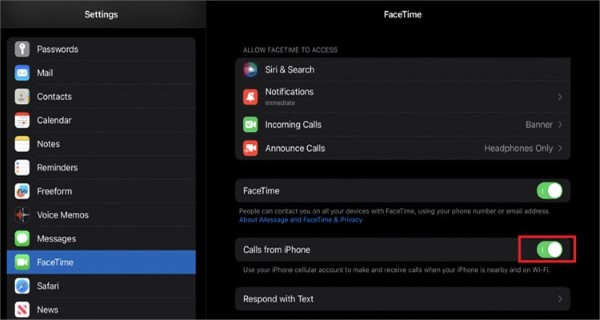 Tiếp theo, mở ứng dụng Cài đặt trên iPad và chọn FaceTime. Sau đó, bật tùy chọn Cuộc gọi từ iPhone (Calls from iPhone) để liên kết cuộc gọi giữa iPhone và iPad.