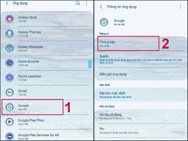 Bước 2: Vào phần Cài đặt > Chọn Ứng dụng > Chọn Google > Chọn tiếp đến mục Thông báo.