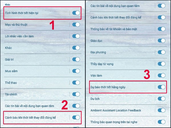 Bước 3: Gạt các thanh trạng thái Tình hình thời tiết hiện tại, Cảnh báo khi thời tiết thay đổi đáng kể và Dự báo thời tiết hàng ngày sang phải để ở trạng thới bật toàn bộ thông báo.