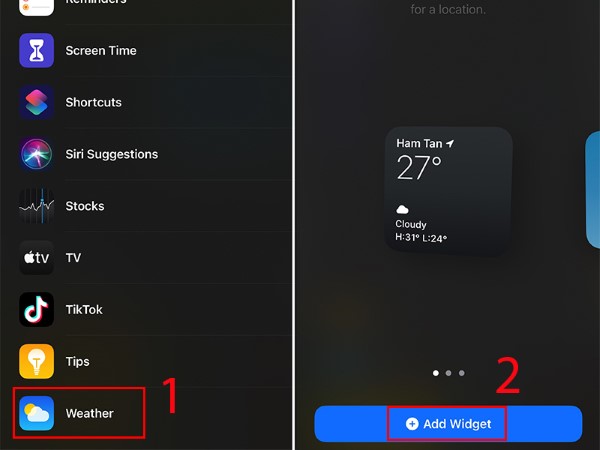 Bước 2: Tìm và chọn vào mục Thời tiết (Weather) > Chọn kích thước > Ấn Thêm tiện ích (Add Widget) > Chọn vị trí của widget mong muốn.
