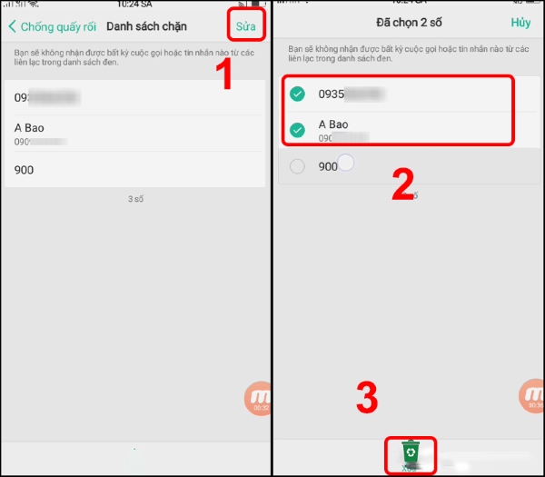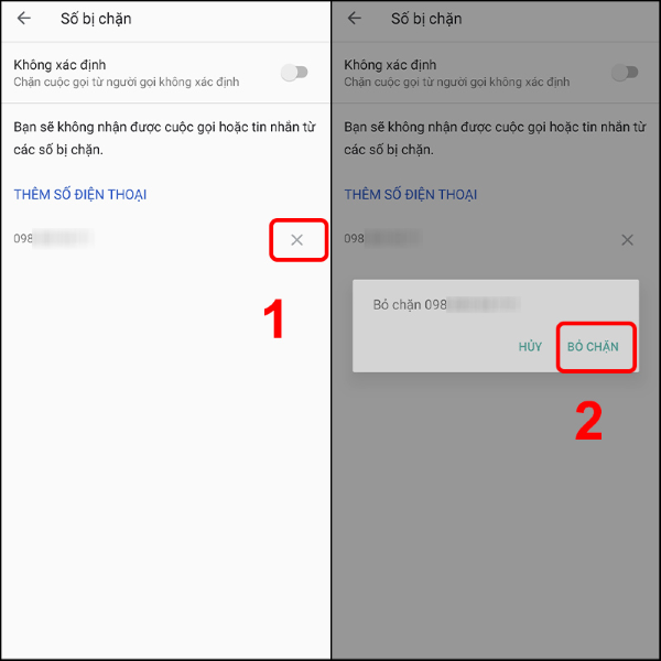 Bước 3: Nhấn chọn Dấu X bên cạnh số điện thoại muốn bỏ chặn > Chọn BỎ CHẶN là được.