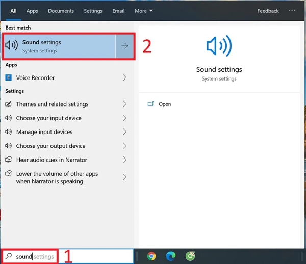 Bước 1: Nhập từ khóa “Sound” vào thanh tìm kiếm trên laptop > chọn Sound settings.