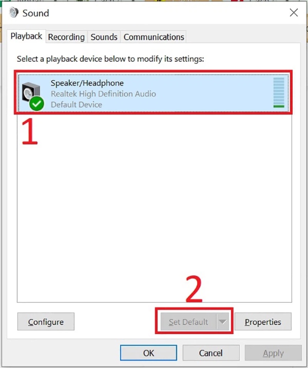 Bước 3: Nhấn vào Speaker (loa) > chọn Set Default để đặt loa làm đầu ra âm thanh mặc định.