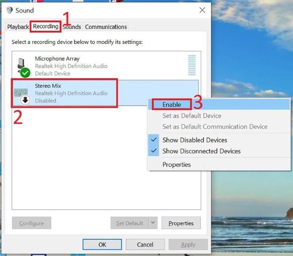 Bước 4: Nhấn vào mục Recording > nhấn chuột phải vào Stereo Mix > chọn Enable để kích hoạt. Nếu không thấy tùy chọn này hiển thị, bạn hãy nhấp chuột phải vào vùng trống trên cửa sổ > chọn Show Disabled Device và Show Disconnect Device.