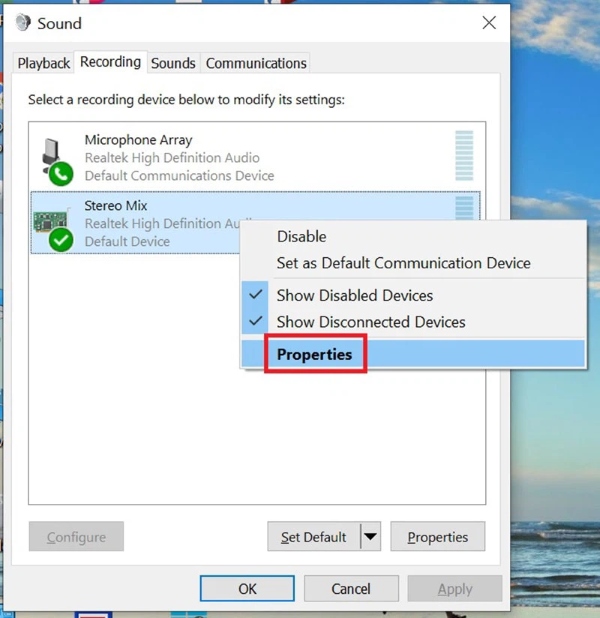 Bước 6: Tiếp tục, nhấn chuột phải vào Stereo Mix > chọn Properties.