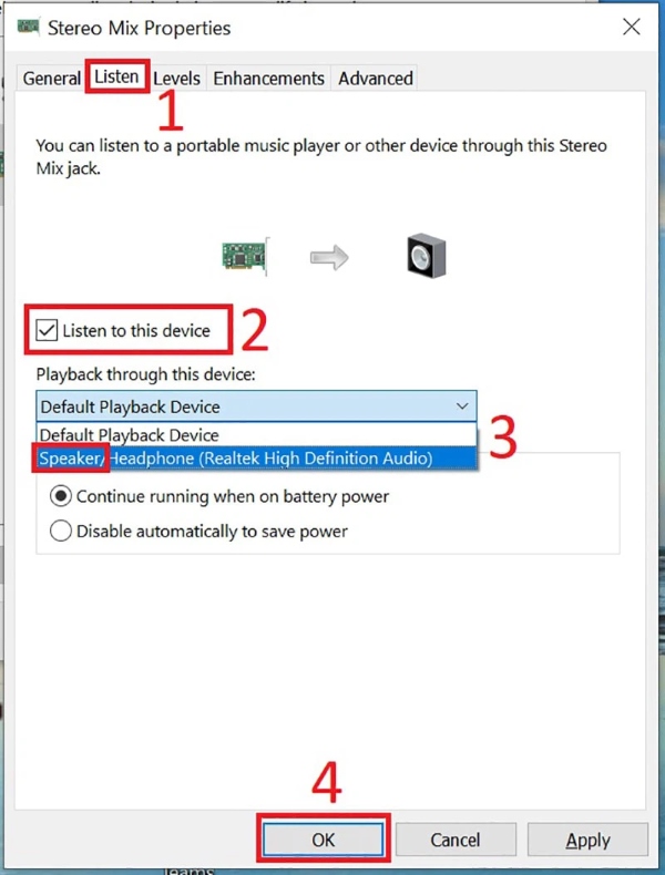 Bước 7: Vào phần Listen > chọn Listen to this device > chọn Speaker > nhấn OK.