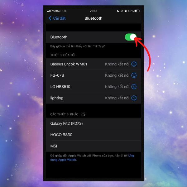 Bước 2: Kéo sai phải để bật tính năng Bluetooth. Lúc này danh sách thiết bị sẽ hiện ra.