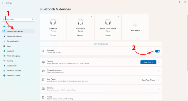 Bước 2: Chọn mục Bluetooth & devices > kéo sang phải để bật Bluetooth.