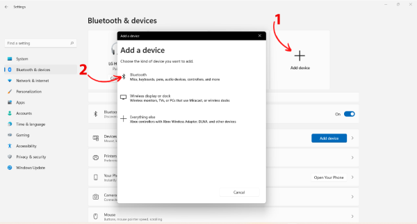 Bước 3: Ấn tiếp Add devices > Bluetooth để tìm kiếm các thiết bị xung quanh.