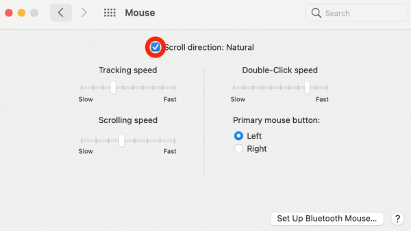 Scroll Direction: Tùy chọn hướng cuộn của chuột. Nếu chọn “Scroll direction: Natural” thì khi cuộn lên, nội dung sẽ di chuyển xuống, và ngược lại. Ngoài ra, bạn có thể thiết lập tốc độ double-click và tốc độ cuộn của chuột trên MacBook.