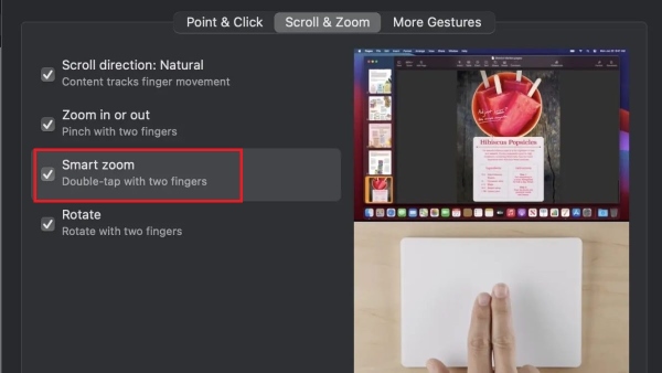 Smart Zoom: Nếu chuột của bạn được hỗ trợ tính năng này, hãy tích vào ô “Smart Zoom”. Khi bật tính năng này, bạn có thể nhấp đúp chuột để phóng to một phần của trang web hoặc tài liệu khi sử dụng MacBook.