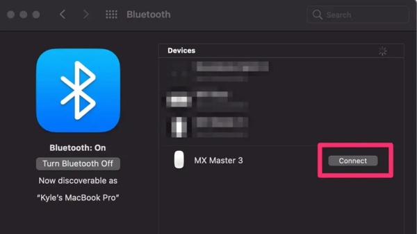 Bước 4: MacBook sẽ tự động dò tìm các thiết bị Bluetooth trong phạm vi. Khi chuột không dây xuất hiện trong danh sách, bạn hãy nhấn vào tên thiết bị và chọn Connect để hoàn tất kết nối chuột không dây với MacBook.