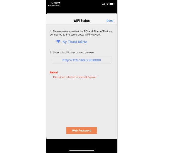 Bước 3: Ngay sau đó có một địa chỉ IP hiển thị. Bạn nhập địa chỉ này lên trên trình duyệt web của máy tính để bắt đầu quá trình kết nối iPad với máy tính.