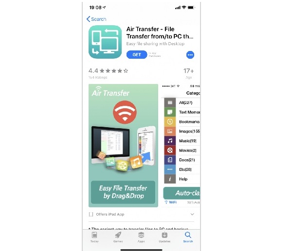 Bước 1: Trên iPad bạn mở App Store -> nhấn vào ô tìm kiếm và gõ từ khóa “Air Transfer” để tải ứng dụng này về máy