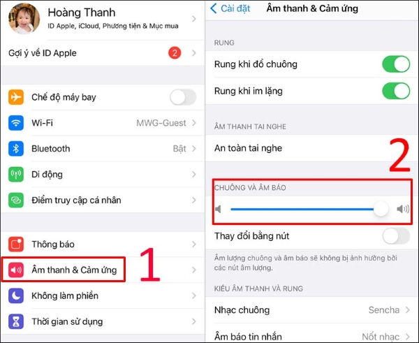 Người dùng mở vào Cài đặt trên iOS > Chọn Âm thanh & Cảm ứng > tiến hành tăng âm lượng ở phần Chuông & Thông báo bằng cách kéo thanh trượt âm lượng đến mức phù hợp là được.