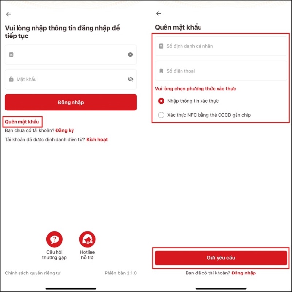 Người dùng quên thông tin mật khẩu VNeID