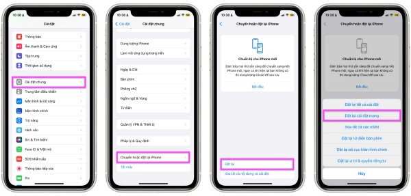 Mở ứng dụng Cài đặt trên iPhone của bạn, và chọn mục Cài đặt chung > Di chuyển xuống vị trí phía dưới và chọn Chuyển hoặc đặt lại iPhone > Chọn Đặt lại > Chọn Đặt lại cài đặt mạng để quá trình được tự động thực hiện.