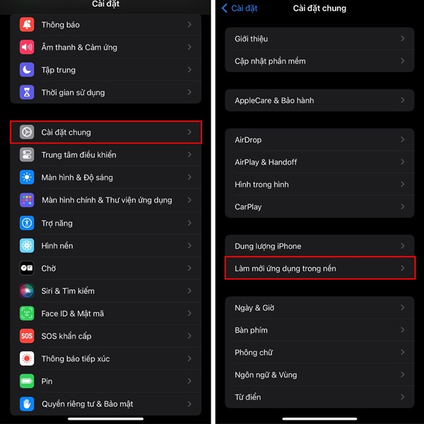 Với việc tắt làm mới ứng dụng trong nền, bạn sẽ ngăn được quá trình cập nhật tự động nên giúp thời lượng pin được kéo dài hơn. Bạn hãy truy cập vào mục Cài đặt, sau đó bấm vào mục Cài đặt chung và nhấn chọn mục Làm mới ứng dụng trong nền.
