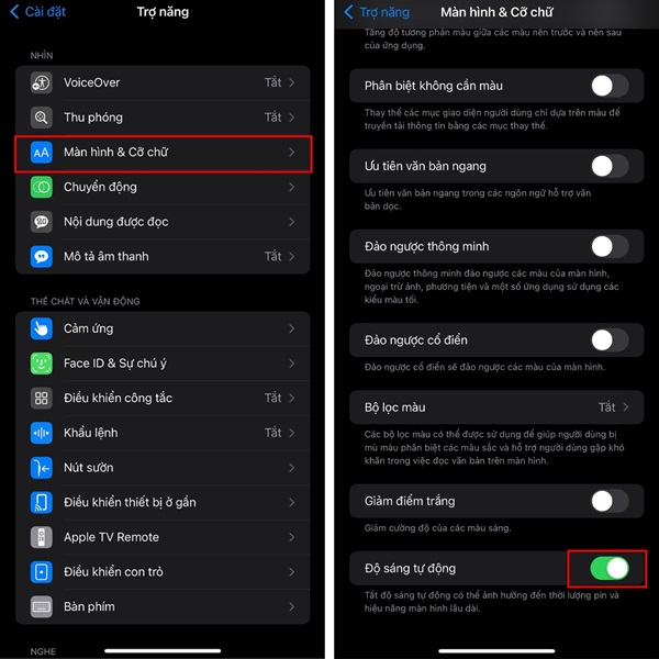 Để bật tính năng độ sáng tự động, bạn truy cập vào mục Cài đặt, kéo xuống dưới và nhấn chọn mục Trợ năng. Sau đó, chọn tiếp mục Màn hình & Cỡ chữ rồi cuộn trang xuống dưới và bật Độ sáng tự động là xong.