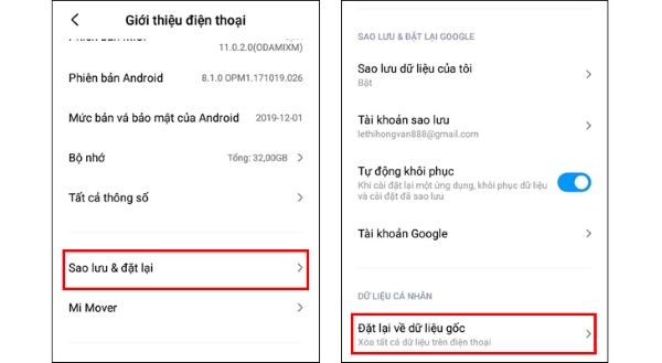 Bước 2: Tiếp theo bạn chọn Sao lưu và đặt lại > chọn Đặt lại về dữ liệu gốc.