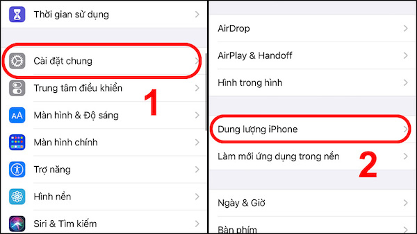 Bước 1: Vào Cài đặt -> Cài đặt chung -> Chọn Dung lượng iPhone.