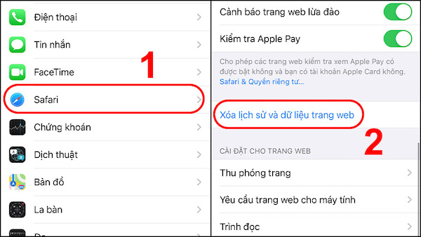Bước 3: Xóa bộ nhớ cache trên Safari: Vào Cài đặt -> Chọn Safari -> Nhấn Xóa lịch sử và dữ liệu trang web.