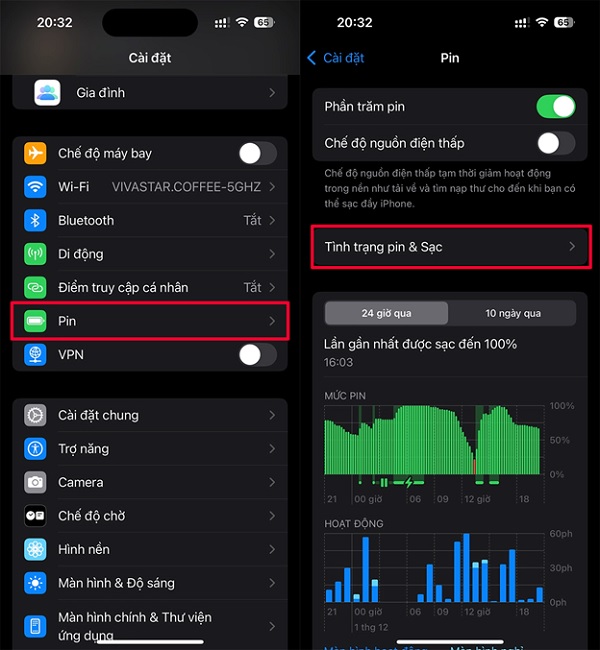 Bước 2: Bạn vào mục Pin, sau đó chọn Tình trạng pin.
